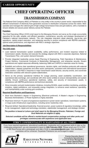 Only male candidates can apply for this Executives Network International Jobs Qualification /Experience Required: Must have a Bachelor’s degree in Engineering (Electrical preferred). A Master’s degree in Engineering. Business Administration, or Power Systems, is highly desirable. Must have minimum 15 years of progressive experience in power sector operations, transmission systems, or large-scale infrastructure organizations, including senior leadership roles. Required skillset: Operational leadership, financial acumen, power systems & regulatory knowledge, safety & risk management, digital and technology orientation, stakeholder management, and strategic mindset. More experienced candidates should apply before 24 February 2026.