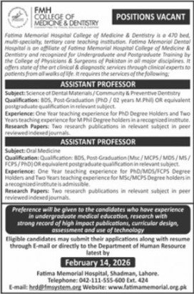 Only male candidates can apply for the FMH College of Medicine and Dentistry Jobs. Qualification /Experience Required: B05, Post-Graduation (PhD/02 years M.Phil) OR equivalent postgraduate qualification ina relevant subject. Experience: One year of teaching experience for PhD Degree Holders and Two Years teaching experience for MPhil Degree holders in a recognized institute. Research Papers: Two research publications in relevant subjects in peer-reviewed indexed journals, and more experienced candidates should apply before 14 February 2026.