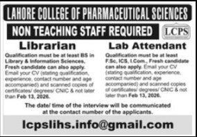 Both male and female candidates can apply for these Lahore College of Pharmaceutical Sciences Jobs 202.6. Qualification must be at least F.Sc, ICS, L.Com. Fresh candidates can also apply. Email your CV (stating qualifications, experience, contact number, and age) and scanned copies of certificates/degrees/CNIC & not later than Feb 13, 2026.