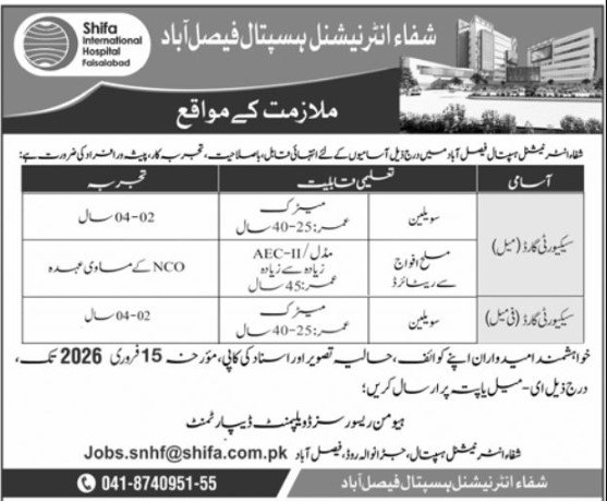 Candidates, if you are seeking the Shifa International Hospital Jobs 2026 in Faisalabad if yes. It would be best if you tried to complete reading this Shifa International Hospital Jobs 2026 because you can easily apply for these vacancies: Male Security Guard and Female Security Guard.